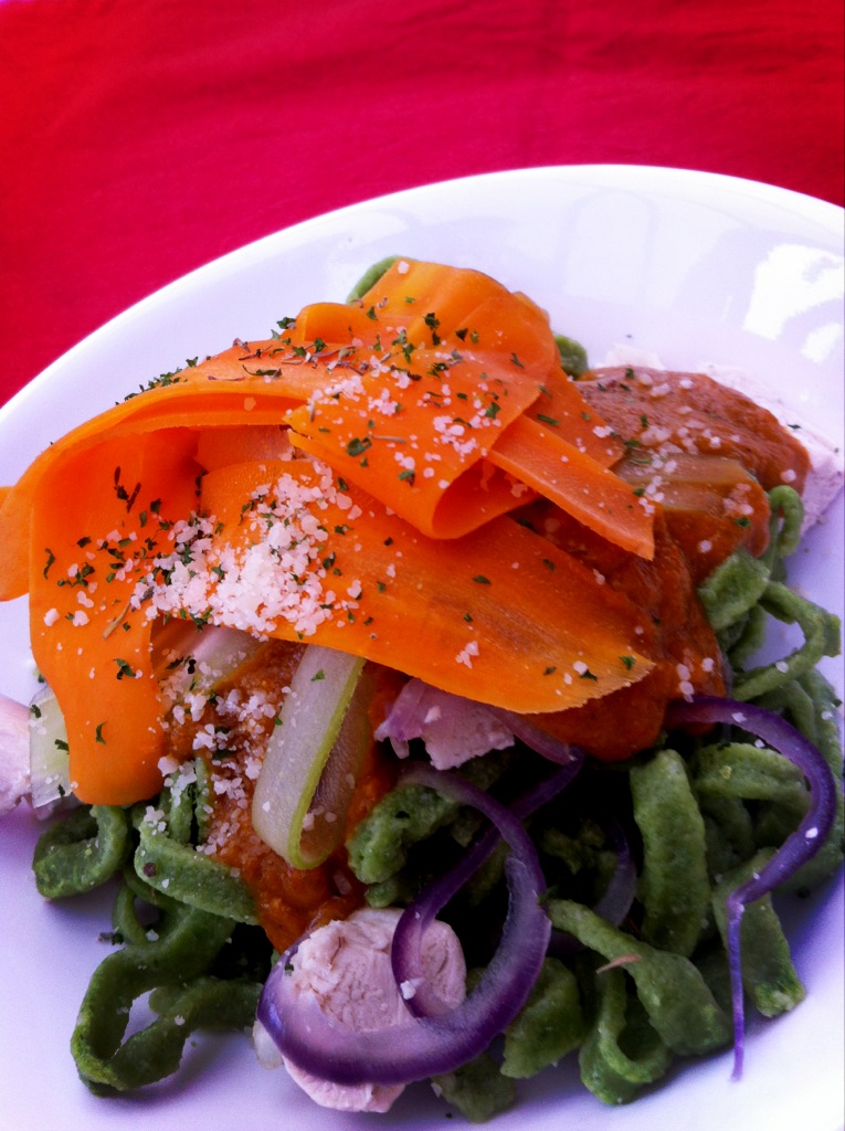 Serve up, garnished with the steamed veggie strips, dried or chopped parsley and a sprinkling of parmesan (optional).