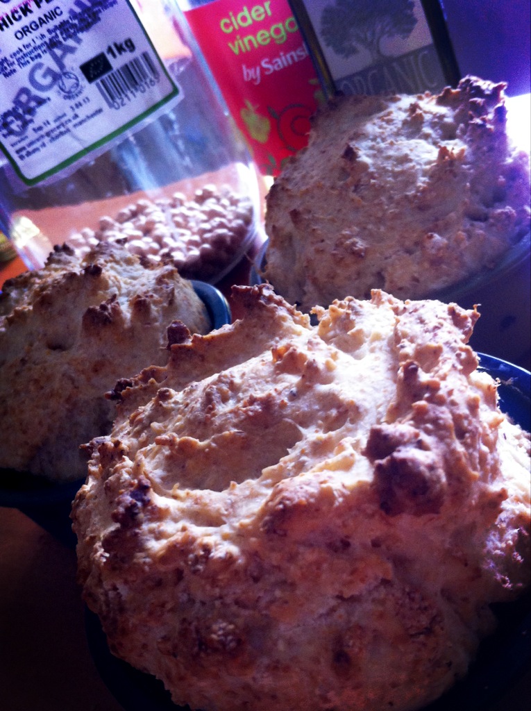 The mixture only makes about 4 decent sized rolls/muffins and I did go on to make a second batch in the form of a loaf, by doubling the recipe. The result was slightly different: soft, dense and a bit doughy, but surprisingly palatable!!!! I was a bit unsure of temperature and timings, as I got distracted and forgot to set the timer, so it was all a bit of a guessing game in the end. Oh well, another excuse to have another go!