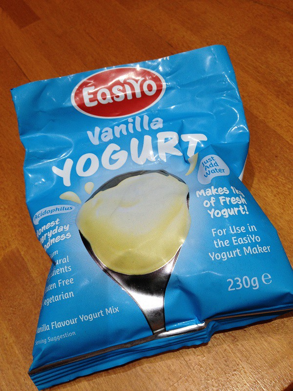 - 115g Easiyo yoghurt mix (half a 230g packet, basically) – I used the vanilla flavour, but there are other flavouring options available, of course – I’m keeping the remaining culture in the freezer to maintain its freshness
