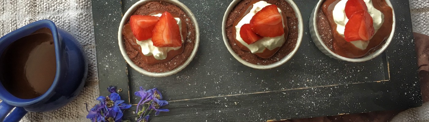 Pour chocolate sauce over the puddings , add a blob of thickened cashew cream to the top, with a strawberry to finish off. Save any excess sauce, cool and pop into into the fridge for a cheeky little snack later with some chopped up banana, maybe?!